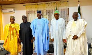 President Muhammadu Buhari hosted the Director General/CEO of NIMASA, Dr Bashir Yusuf Jamoh, HMR, Representing Hong/Gombi, Hon Yusuf Buba, Secretary to the Government of the Federation (SGF) Mr. Boss Mustapha, President Muhammadu Buhari and New Minister of Transportation, Alh Muazu Jaji Sambo during a Sallah Homage visit to the president in Daura, Katsina.