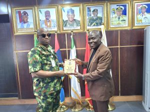 Flag Officer Commanding, Western Naval Command, Rear Admiral Gregory Oamen (left) and the President, Maritime Reporters Association of Nigeria (MARAN) Godfrey Bivbere at a courtesy visit to the Navy in Apapa Lagos towards the upcoming MARAN Annual Maritime Lecture (MAMAL) 2025.