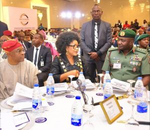 L-R: Chief of Defense Staff, General Christopher Musa, CILT Nigeria President, Mfon Usoro and NPA Managing Director, Dr Abubakar Dantsoho, at the CILT 2025 conference and AGM in Lagos on Wednesday
